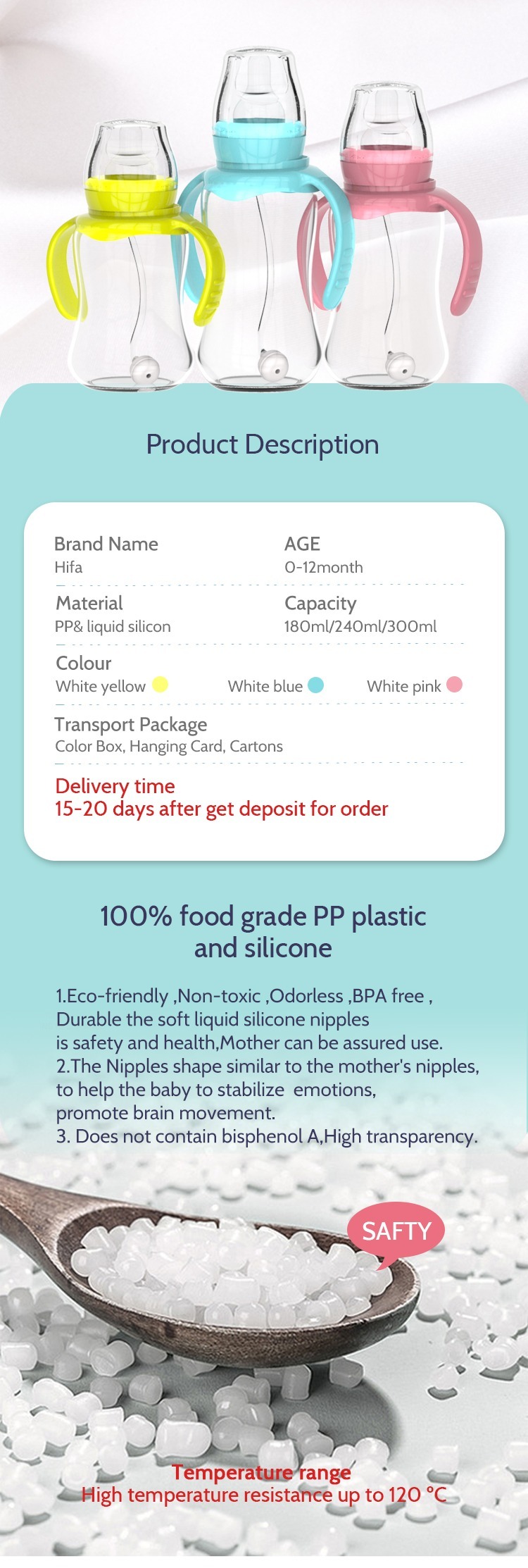 A baby bottle designed specifically for breastfed babies. HiFa breastfeeding bottles with  Nipple are clinically proven to reduce nipple confusion.Hifa Baby Bottle with Nipple enables baby to engage in the same natural sucking actions learned at the breast, allowing for a smooth transition from breast to bottle and back again.