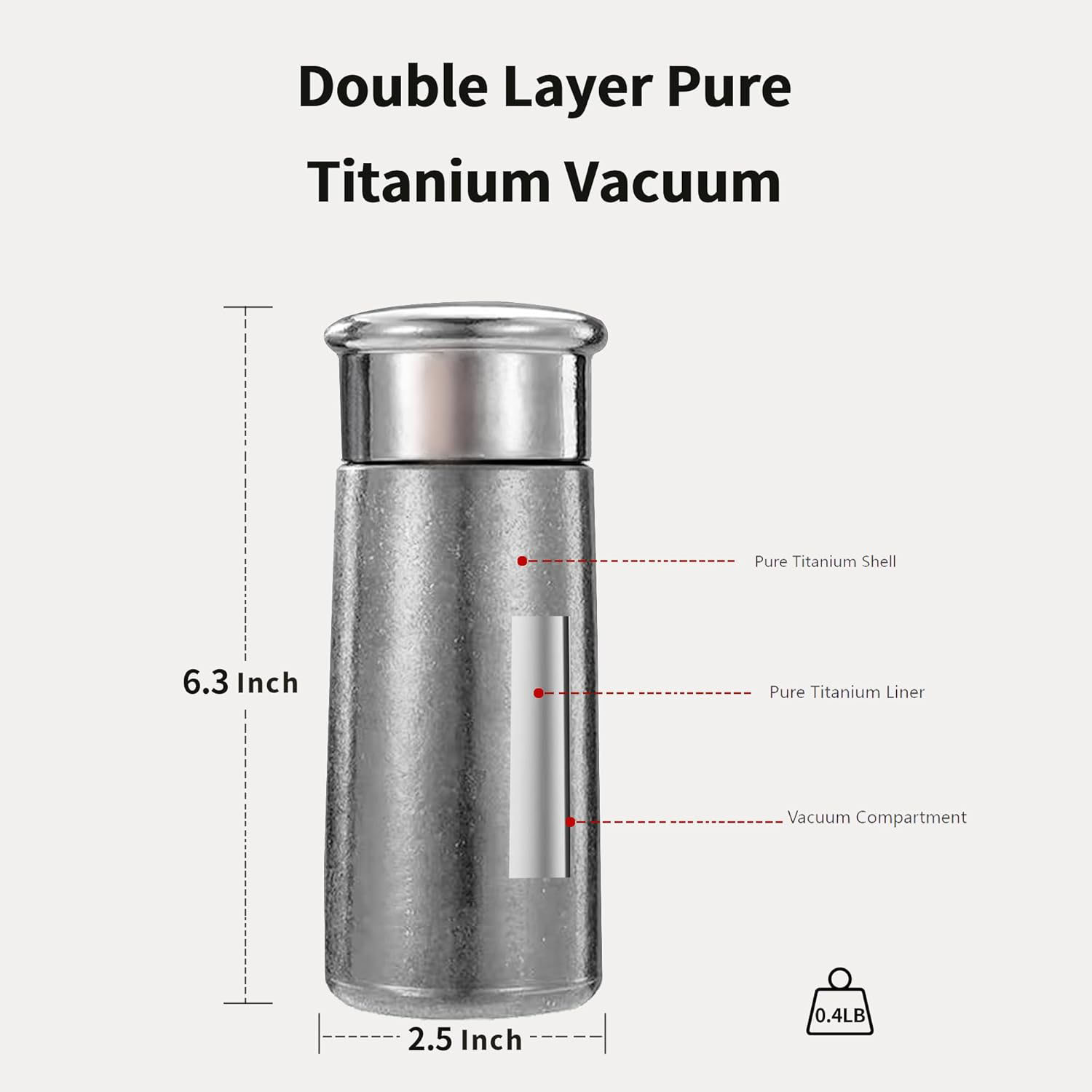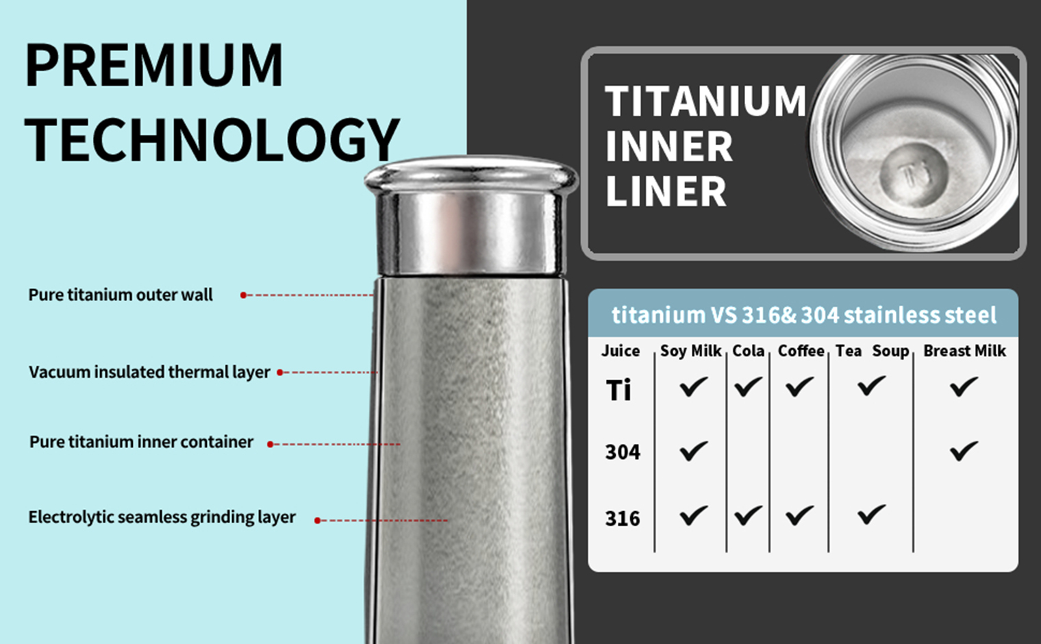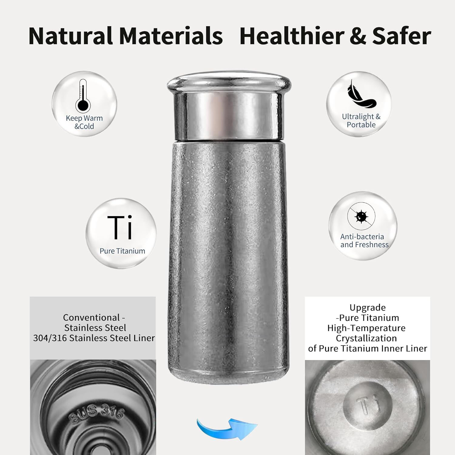 Titanium is strong but much lighter than stainless steel. A pure Ti vacuum bottle is easier to carry, especially for hiking, camping, or travel.