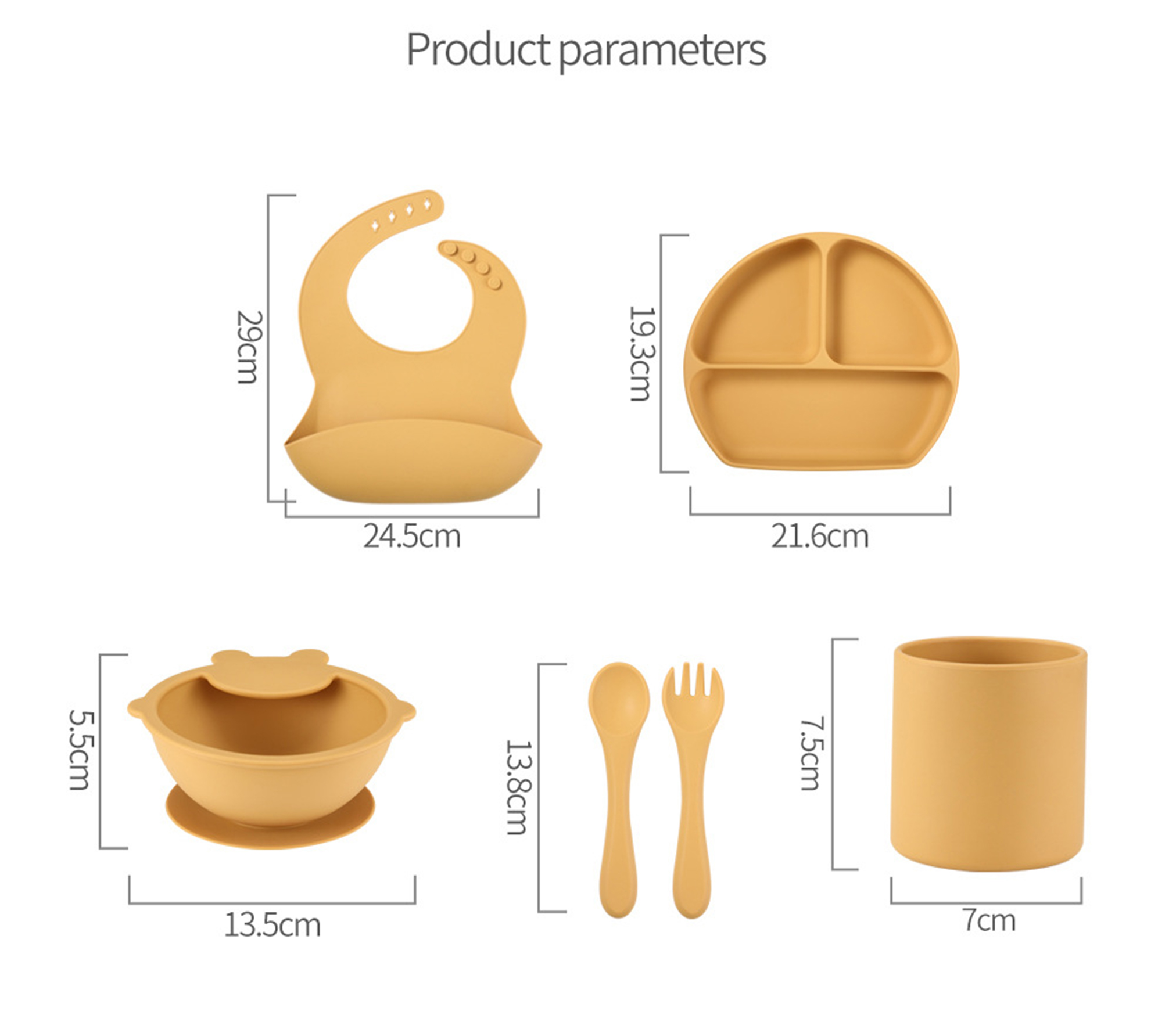 Complete Feeding Set: Includes a bowl, plate, spoon, fork, cup, and bib, offering all the essentials for feeding.