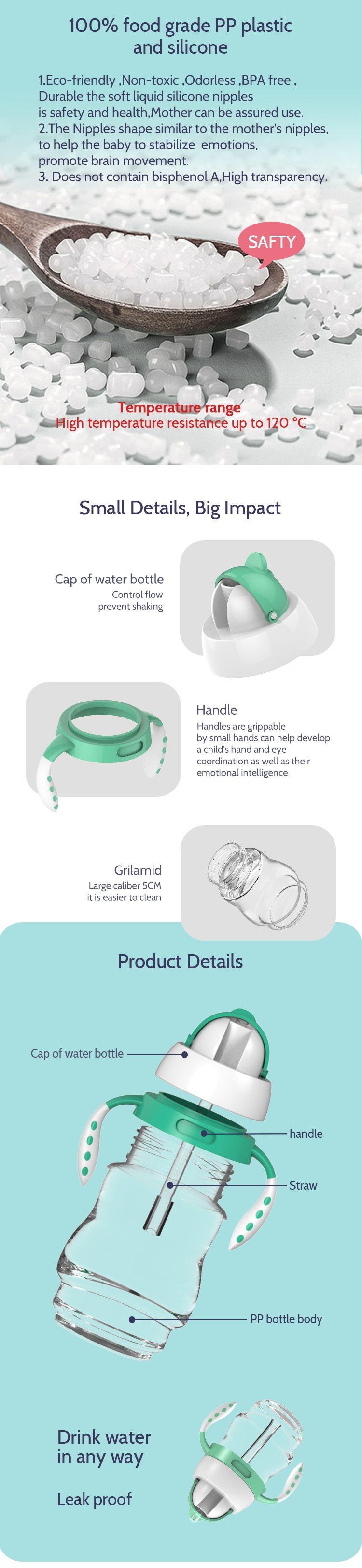MATERIAL: 100% food grade PP plastic and silicone,Eco-friendly,Non-toxic,OdorlessBPA free,Durable the soft liquid silicone nipples is safety and health.