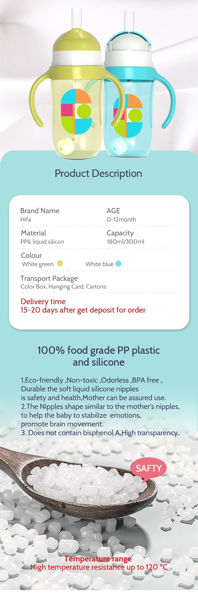 MATERIAL: 100% food grade PP plastic and silicone,Eco-friendly,Non-toxic,OdorlessBPA free,Durable the soft liquid silicone nipples is safety and health.