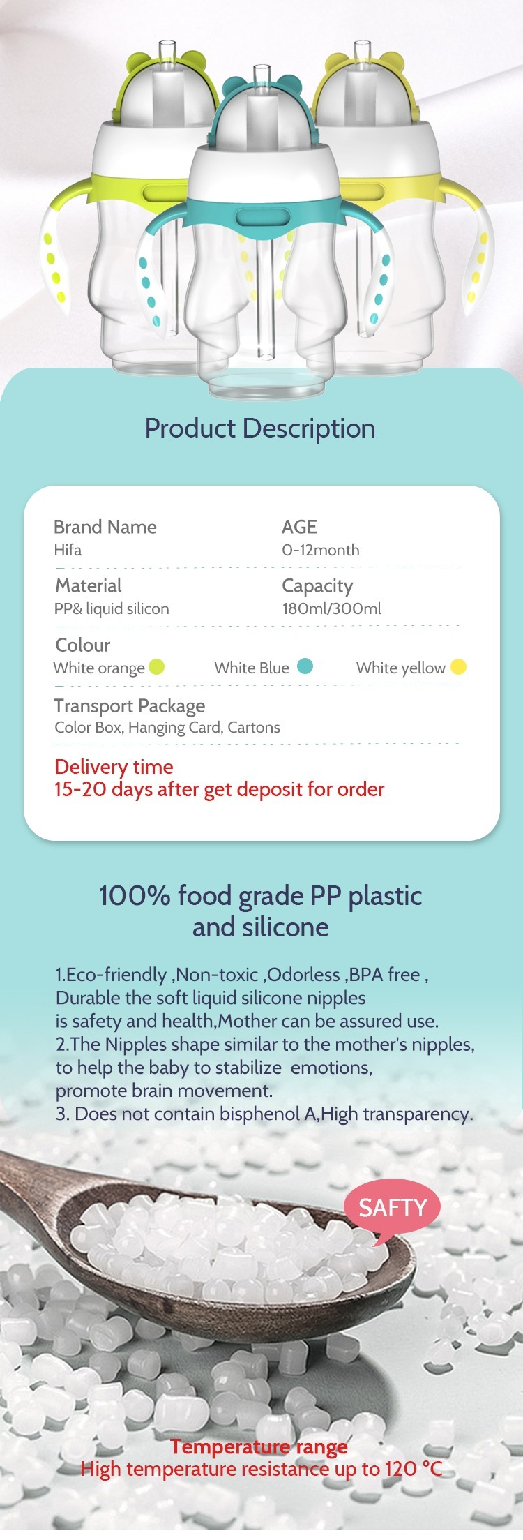 | Transport Package | Color Box, Hanging Card, Cartons | Bottle&Nipple Material | PP,Liquid Silicone |