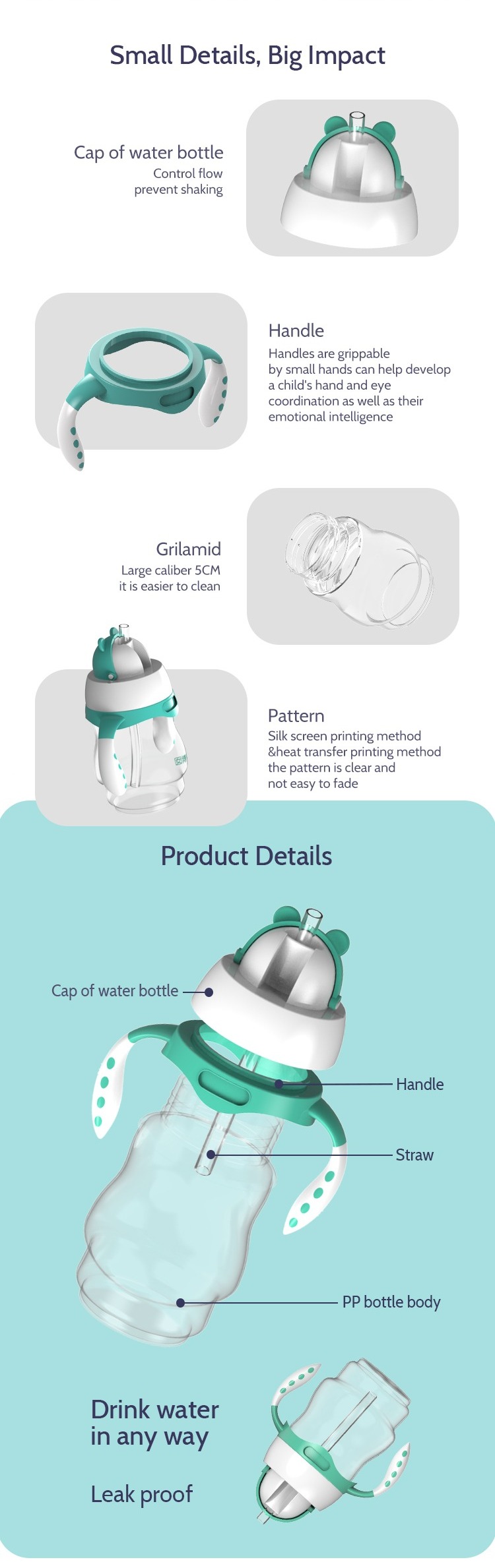 MATERIAL: 100% food grade PP plastic and silicone,Eco-friendly,Non-toxic,Odorless,BPA free,Durable the soft liquid silicone nipples is safety and health.