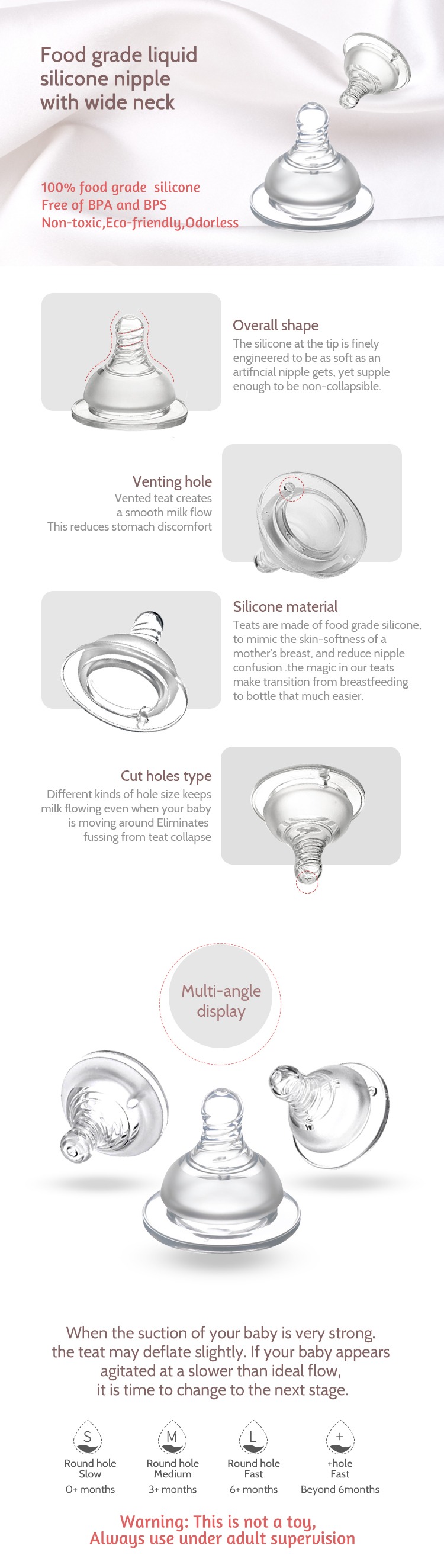 3.Anit-Colic with no plastic components. Made of super-soft, high-grade silicone
